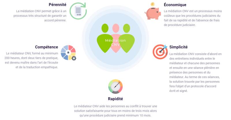 La médiation basée sur la Communication NonViolente (CNV) intègre dans ce processus structuré la Communication NonViolente tout au long du déroulé de la médiation (sujets, faits, vécus, reconnaissance mutuelle des besoins, recherche des solutions).